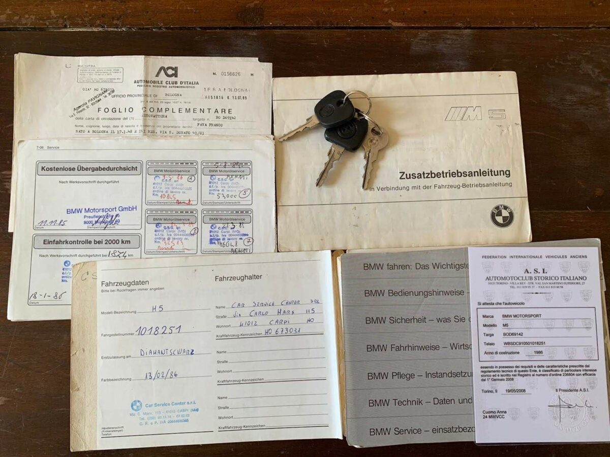 Eerste eigenaar van dit eerste type M5 was Franco Fava, die op 17 januari 1948 werd geboren in Bologna. Deze zakenman kreeg de auto op 3 november 1988 in handen. Op 20 mei 1997 kwam de auto in het bezit van Anna Cuomo (geboren op 9 februari 1950 te Ischia, een klein eilandje voor de kust van Napels). Zij was echter niet de regelmatige bestuurder, dat was haar zoon. Maar in verband met verzekeringstechnische redenen kwam de auto op naam van deze dame. Op 3 mei 2018 werd Niccolo Cravetto (geboren op 4 maart 1987 te Turijn) de gelukkige eigenaar. Wij kochten de auto van Niccolo en zodoende kwam deze uniek vroege M5 (nr. 251 van alle ooit gebouwde M5’s) op 9 mei 2019 in ons bezit.